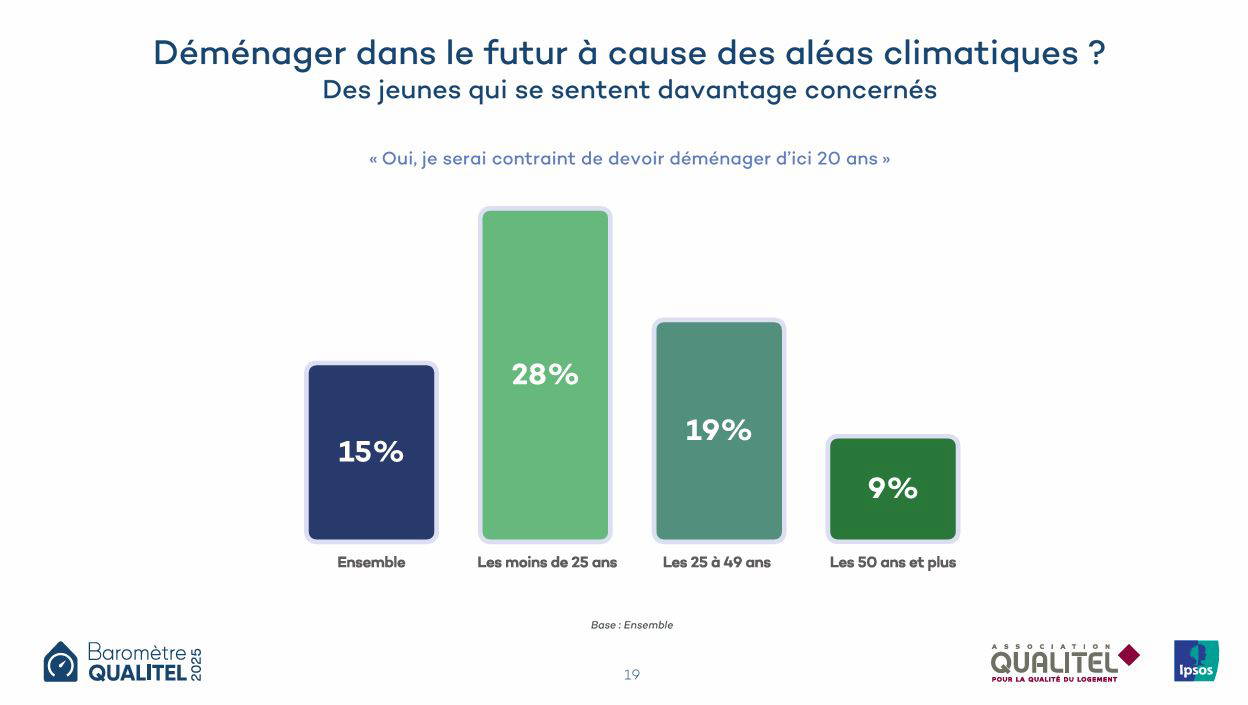 Cette vulnérabilité suscite des préoccupations croissantes : 74 % pensent qu’ils seront confrontés à de nouveaux aléas dans leur logement actuel, et 42 % s’en disent inquiets. Les plus jeunes, notamment, envisagent des conséquences concrètes : 28 % des moins de 25 ans estiment qu’ils pourraient devoir déménager d’ici vingt ans pour cette raison.