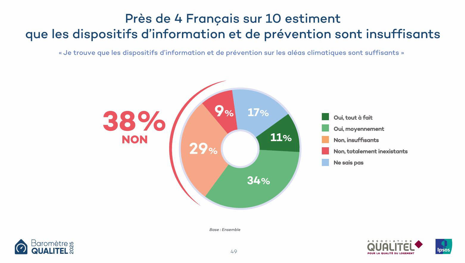 Lors de l’achat ou de la location, seuls 30 % des propriétaires ont pris en compte le risque climatique. La majorité (65 %) n’a reçu aucune information sur la vulnérabilité du bien, et 38 % jugent les dispositifs d’information insuffisants.