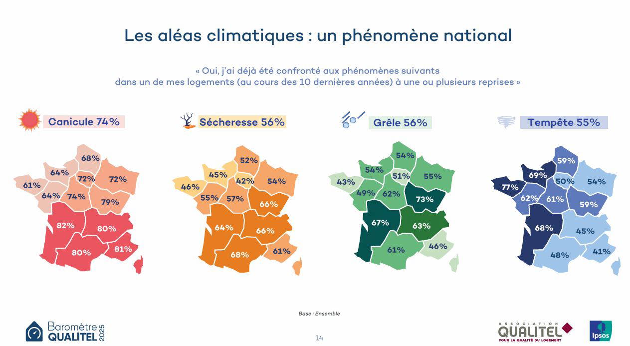 Près de 9 personnes sur 10 déclarent avoir déjà vécu un aléa climatique, principalement la canicule (74 %), la sécheresse ou la grêle (56 %) et les tempêtes (55 %). Aucune région n’est épargnée, et les impacts se font sentir dans tous les types de logements.