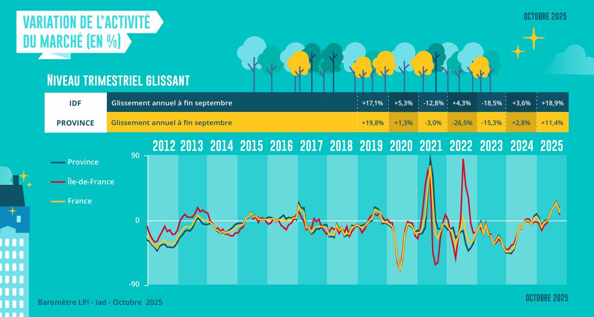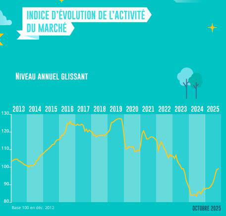 Le redressement du marché de l’ancien est bien installé. Les achats de logements réalisés par des particuliers durant le 9 premiers mois de 2025 sont ainsi en progression de 16.1 %, en glissement annuel. Mais si le printemps avait été salué en raison d’un regain d’activité remarquable, avec des ventes qui s’élevaient à un rythme oublié depuis longtemps (en niveau trimestriel glissant, + 31.0 % en juillet), la demande a exprimé des premiers signes d’essoufflement au milieu de l’été. Ainsi, alors qu’habituellement la pause du marché s’accompagne d’un repli des ventes de logements anciens de 25 % en août (en moyenne, sur longue période), cette année la baisse a été de 34.6 %, car la demande est inquiète. Et en septembre, le rebond saisonnier du marché n’a pas compensé l’affaiblissement estival : + 21.6 % en glissement mensuel, contre + 20.7 % en longue période.