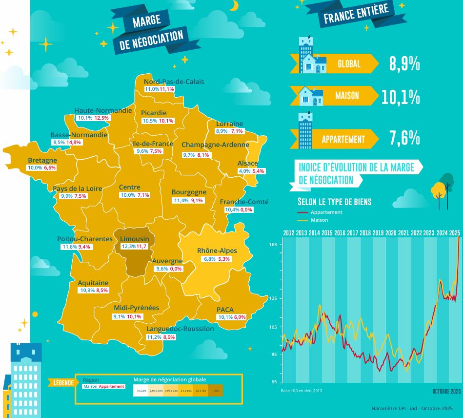 Depuis juin 2021 lorsque les marges étaient au plus bas, leur progression a été rapide : + 146 % pour l’ensemble du marché (+ 24 % par an), moins rapide pour les appartements (+ 130 %, soit + 22 % par an) que pour les maisons (+ 158 %, soit + 25 % par an). Cette progression a été la réponse du marché à la baisse générale d’une demande déstabilisée par le changement de stratégie de la BCE et la remontée des taux des crédits qui s’en est suivie, et surtout par le resserrement de l’accès au crédit imposé par la Banque de France. Car confrontée à la difficulté d’accéder au crédit, la demande cherche à négocier autant que possible. Ainsi en septembre 2025, les marges s’affichaient à 8.9 %, soit 80 % au-dessus de leur moyenne de longue période (respectivement 7.6 % et 77 % pour les appartements ; 10.1 % et 81 % pour les maisons).