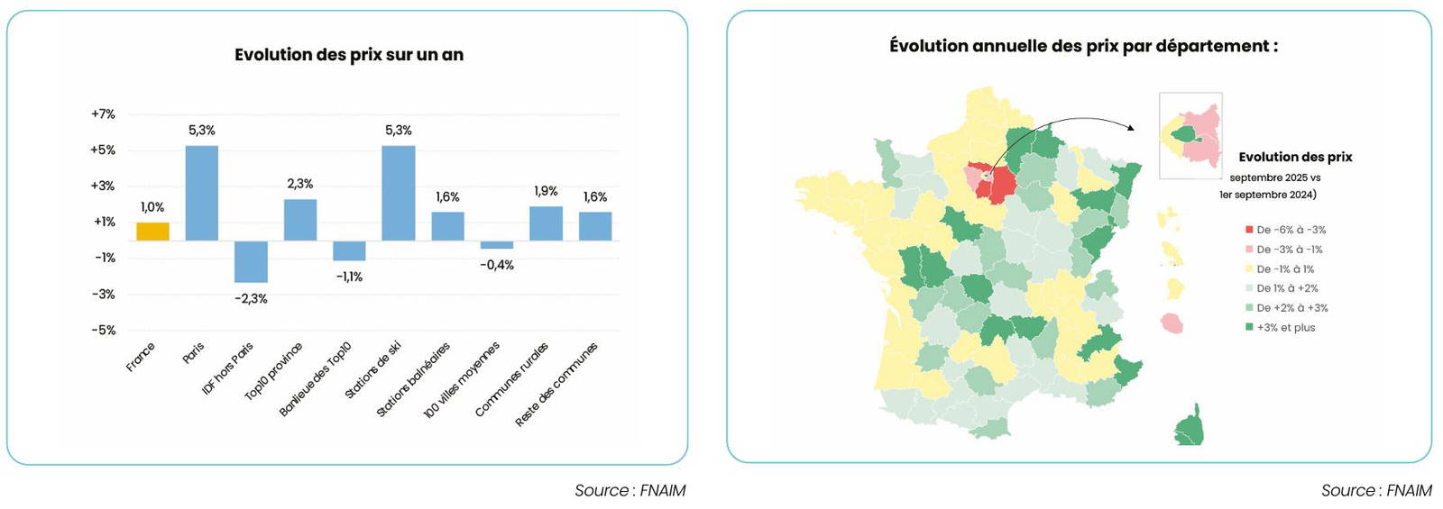 Après avoir baissé en 2023 et s’être stabilisés en 2024, les prix s’inscrivent en légère hausse (+1% sur un an au 1er septembre 2025), à un rythme similaire à celui de l’inflation.