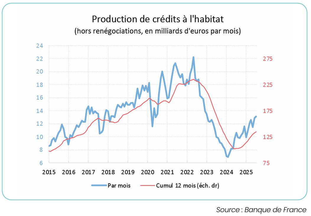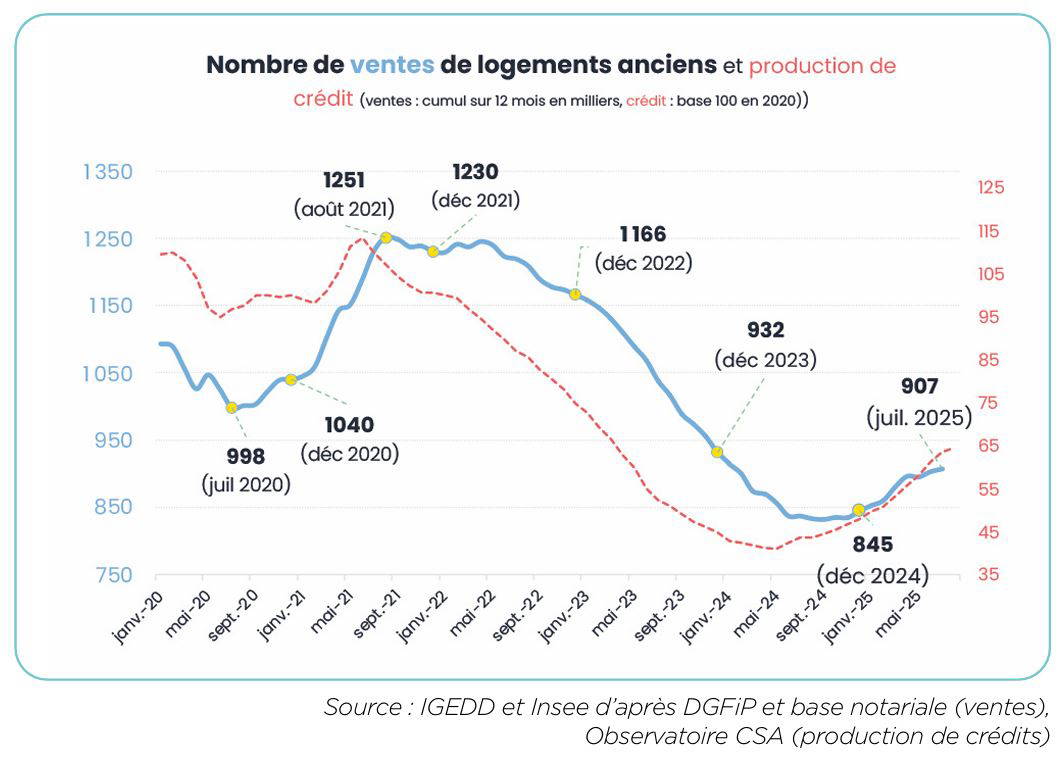 Sur 12 mois à fin juillet, 910 000 ventes ont été réalisées, un chiffre en hausse de +8,7% sur un an. Le redressement des ventes est en cours depuis octobre 2024. Depuis mai 2025, les ventes poursuivent leur hausse à un rythme moindre, en lien avec la fin de la baisse des taux de crédits, la hausse des DMTO et les incertitudes politiques, notamment.