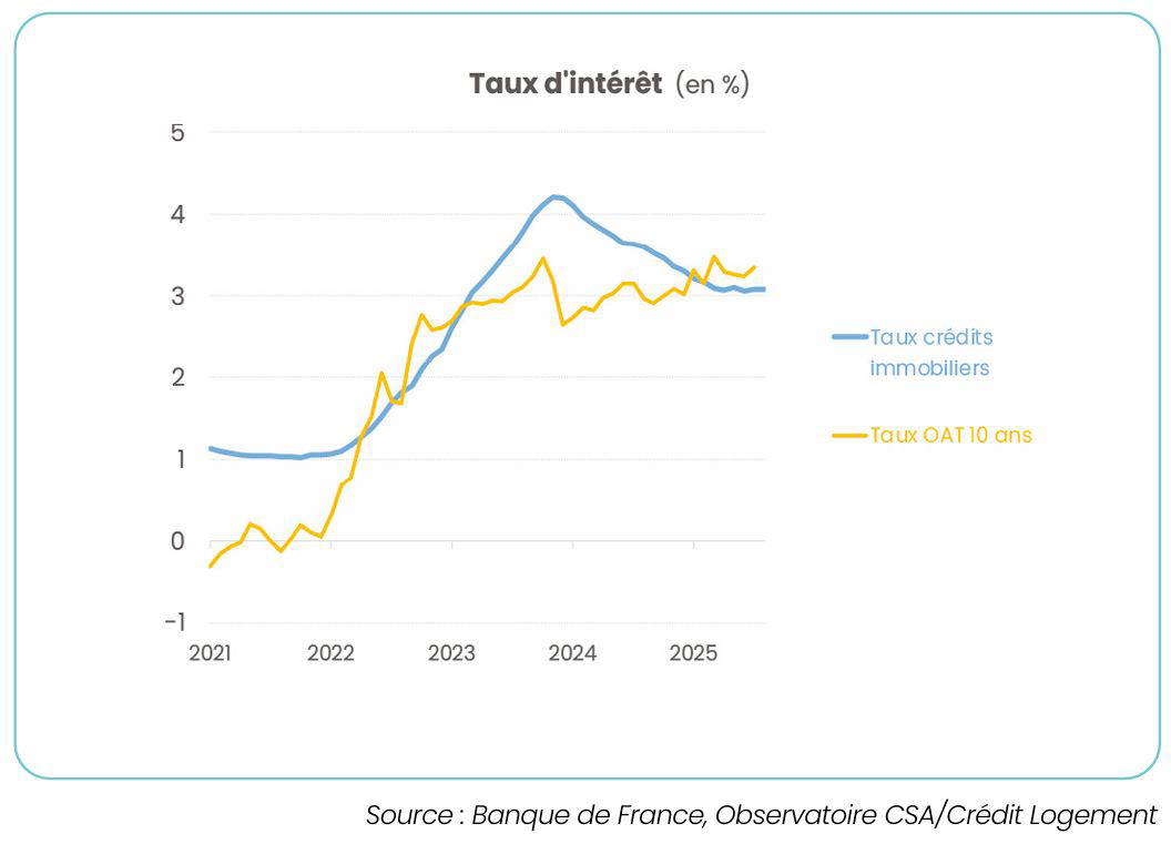 Les taux des crédits immobiliers ont reculé de 113 points de base en un peu moins de deux ans. Cette détente ne compense toutefois qu’un tiers de leur flambée des deux années précédentes, mais elle a offert une bouffée d’oxygène au marché du logement. Stables depuis mars 2025, ils s’établissent à 3,08 % en août 2025 selon l’Observatoire CSA/Crédit Logement, frôlant ainsi le seuil psychologique des 3%. Fait notable, ces taux se situent désormais en dessous des OAT à 10 ans, dans un contexte de concurrence entre les banques pour capter de nouveaux clients, et de défiance des investisseurs à l’égard de la dette publique française.