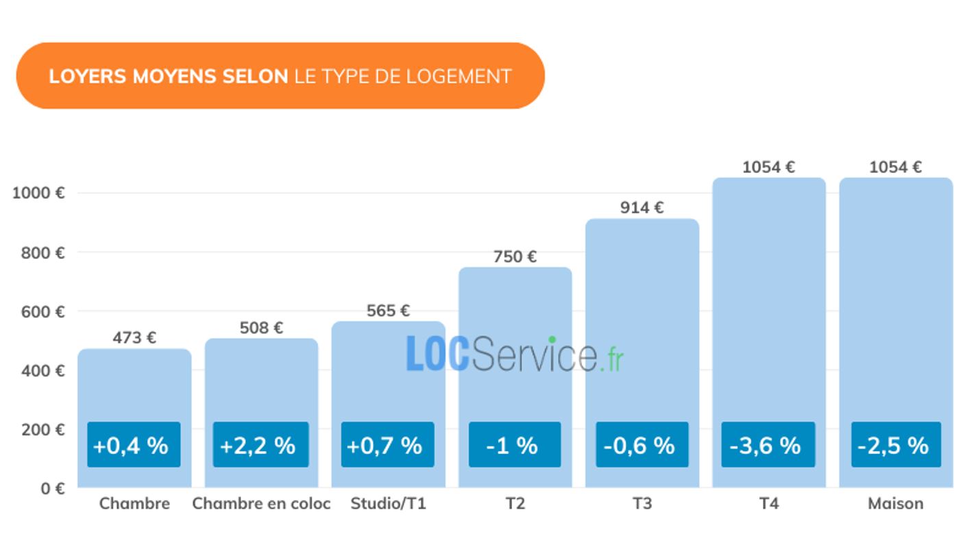 Les loyers moyens constatés en 2025 sont de : – 473 € pour une chambre (14 m²), – 565 € pour un studio/T1 (23 m²), – 750 € pour un T2 (42 m²), – 914 € pour un T3 (63 m²), – 1 054 € pour un T4 ou une maison.