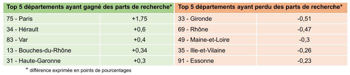 Le gain d’attractivité observé dans les Bouches-du-Rhône dans le tableau précédent se retrouve ici concernant Marseille, qui grimpe de deux places dans le classement. Bordeaux et Rennes cèdent quelques places, sans doute par effet de vases communicants avec Paris qui est en nette hausse.