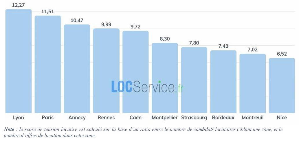 Cependant, si l’on s’intéresse uniquement à la tension locative, c’est-à-dire la difficulté à trouver un logement à louer dans une ville (ou la facilité à trouver un locataire), ce classement change quelque peu comme l’illustre le graphique ci-dessous. Paris prend la seconde place après Lyon, tandis qu’Angers sort du top 10 à la faveur de Montreuil dans le 93.