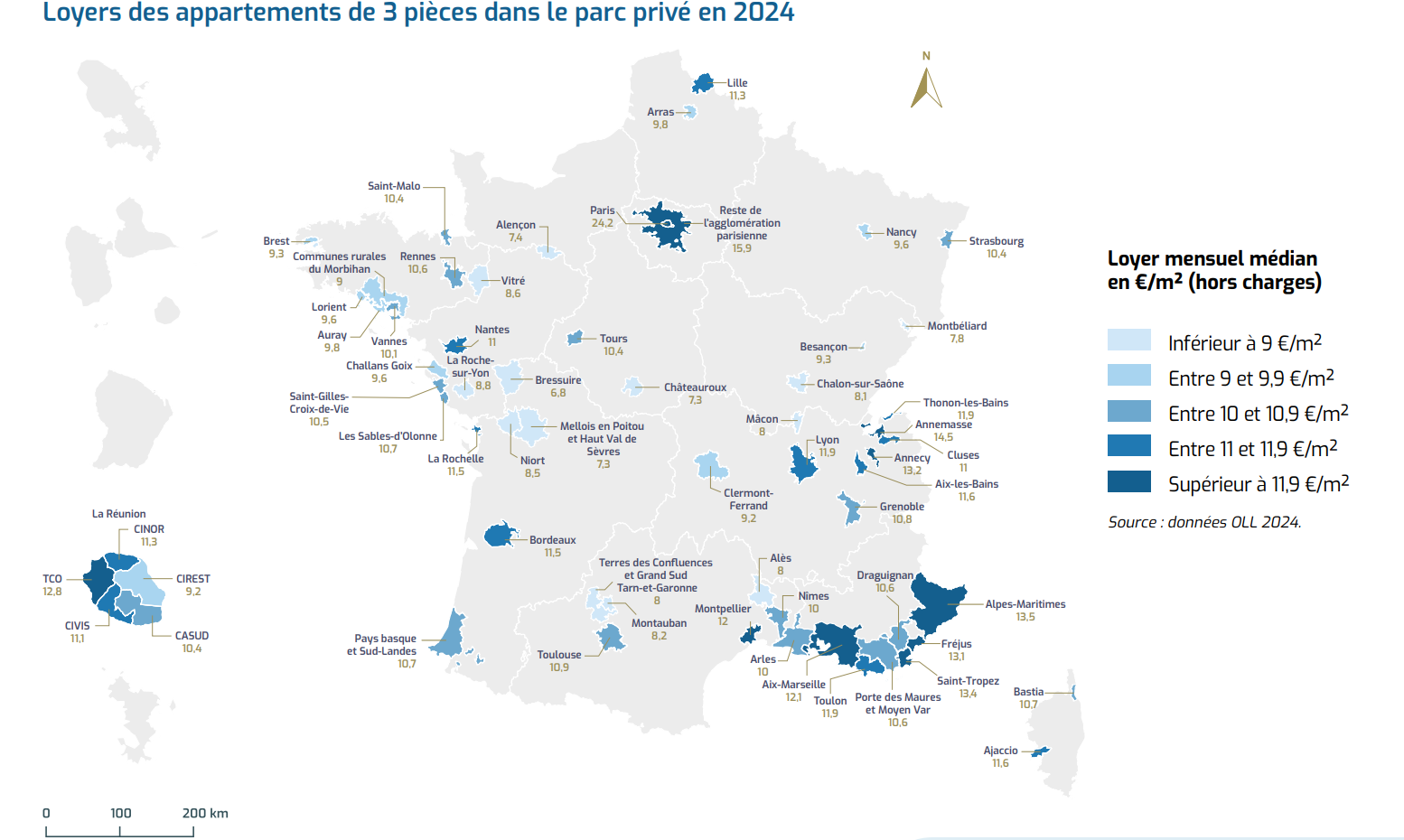 Les valeurs les plus élevées s’observent dans les grandes métropoles et zones dynamiques : Aix-Marseille (12,1 €/m²), Montpellier (12 €/m²), Lyon (11,9 €/m²), Bordeaux (11,5 €/m²), ainsi que sur les littoraux atlantique et méditerranéen (Fréjus 13,1 €/m², Saint-Tropez 13,4 €/m²) et en Haute-Savoie près de la frontière suisse (Annemasse 14,5 €/m², Annecy 13,2 €/m²) ou encore en région parisienne (15,9 €/m²).