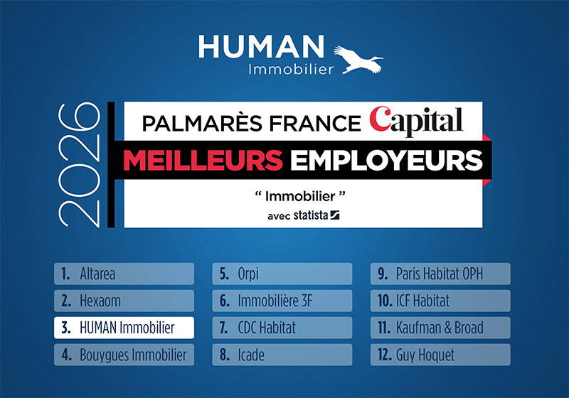 Le premier réseau intégré de France d’agences immobilières multiplie décidément les distinctions. Après avoir été élue enseigne immobilière la mieux notée sur Google, HUMAN Immobilier vient d’être désigné « Meilleur employeur de France » parmi les réseaux d’agences immobilières par le magazine Capital.